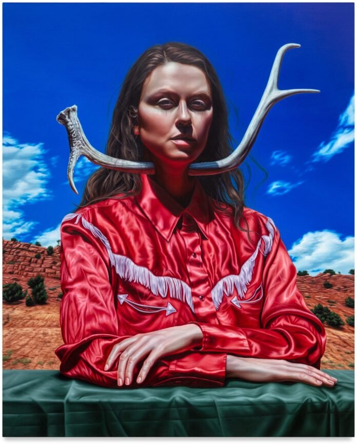At the heart of Games of Chance are canvases so sharply detailed they feel three‑dimensional: knives glinting, animal bones bleached white, fabric textures so tactile you imagine you could run your fingers across them. Yet it is West’s deployment of these elements—paired with her own likeness in cowboy attire—that transforms ordinary Western tropes into a stage for magical realism.